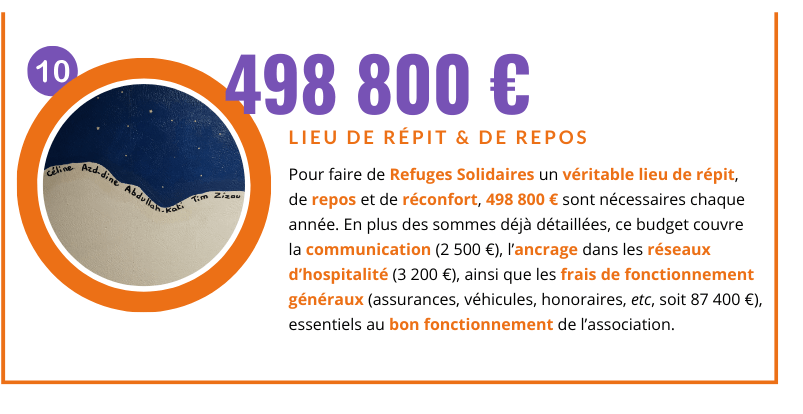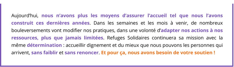 Refuges Solidaires traverse actuellement une situation critique. L’augmentation constante des besoins d’accueil et d’accompagnement, couplée à une diminution des ressources financières, met en péril la pérennité de notre action. Pour continuer à offrir un lieu d’accueil digne et solidaire à celles et ceux qui en ont besoin, nous lançons une campagne de dons d’urgence. Elle se veut la plus large possible, car seule une mobilisation collective à grande échelle nous permettra de garantir la pérennité de l’association et de poursuivre notre mission.