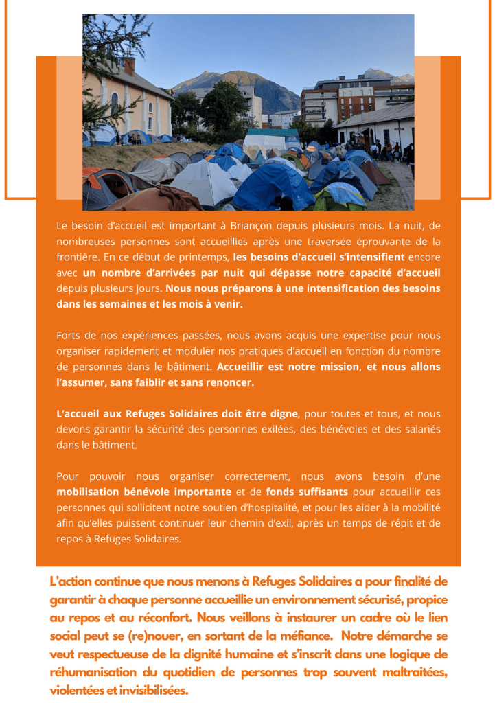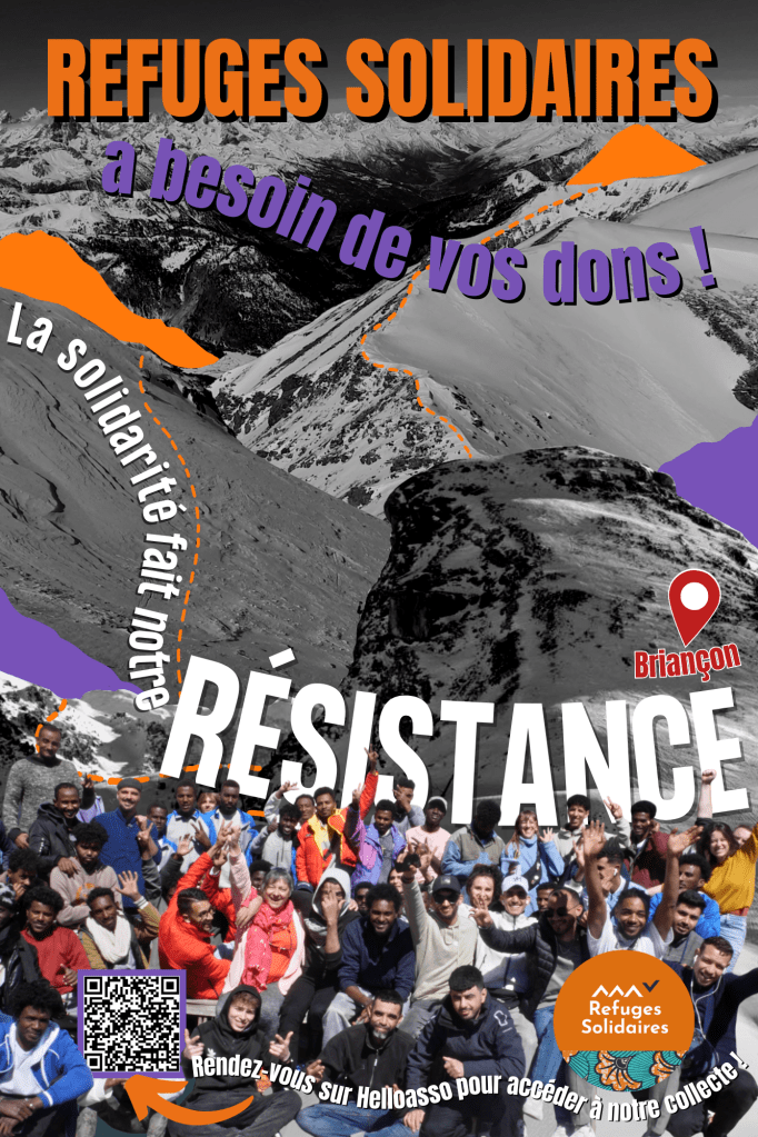 Nous nous adressons ici à vous, bénévoles, solidaires ou encore soutiens de Refuges Solidaires, que vous habitiez à Briançon, en France ou même ailleurs. Votre engagement est une force précieuse, et dans ce moment difficile, nous savons pouvoir compter sur votre solidarité. Votre mobilisation, vos idées, votre énergie peuvent faire toute la différence : c’est ensemble et grâce à nos mobilisations que nous pourrons continuer à faire vivre Refuges Solidaires.